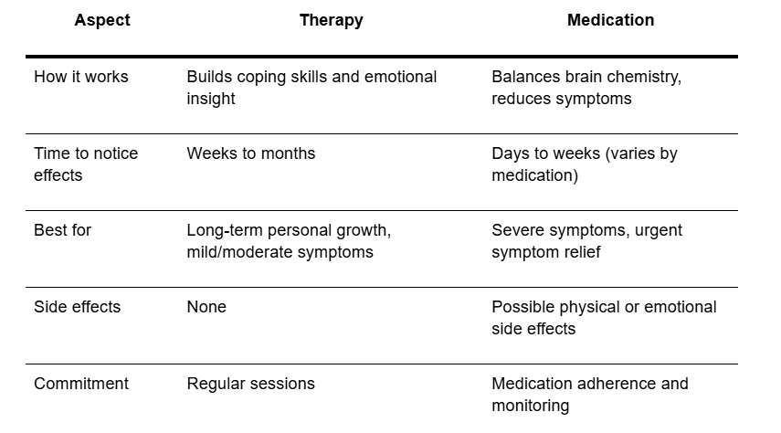 Both medication and therapy can help you feel better, and choosing one, the other, or both depends on your needs and preferences. Medication can relieve severe or disruptive symptoms quickly, while therapy teaches skills that last long after sessions end. Select the option that feels right for you and fits your current situation, and know that it’s okay to adjust your approach if something isn’t working. Every step you take helps you learn more about yourself and moves you closer to recovery.